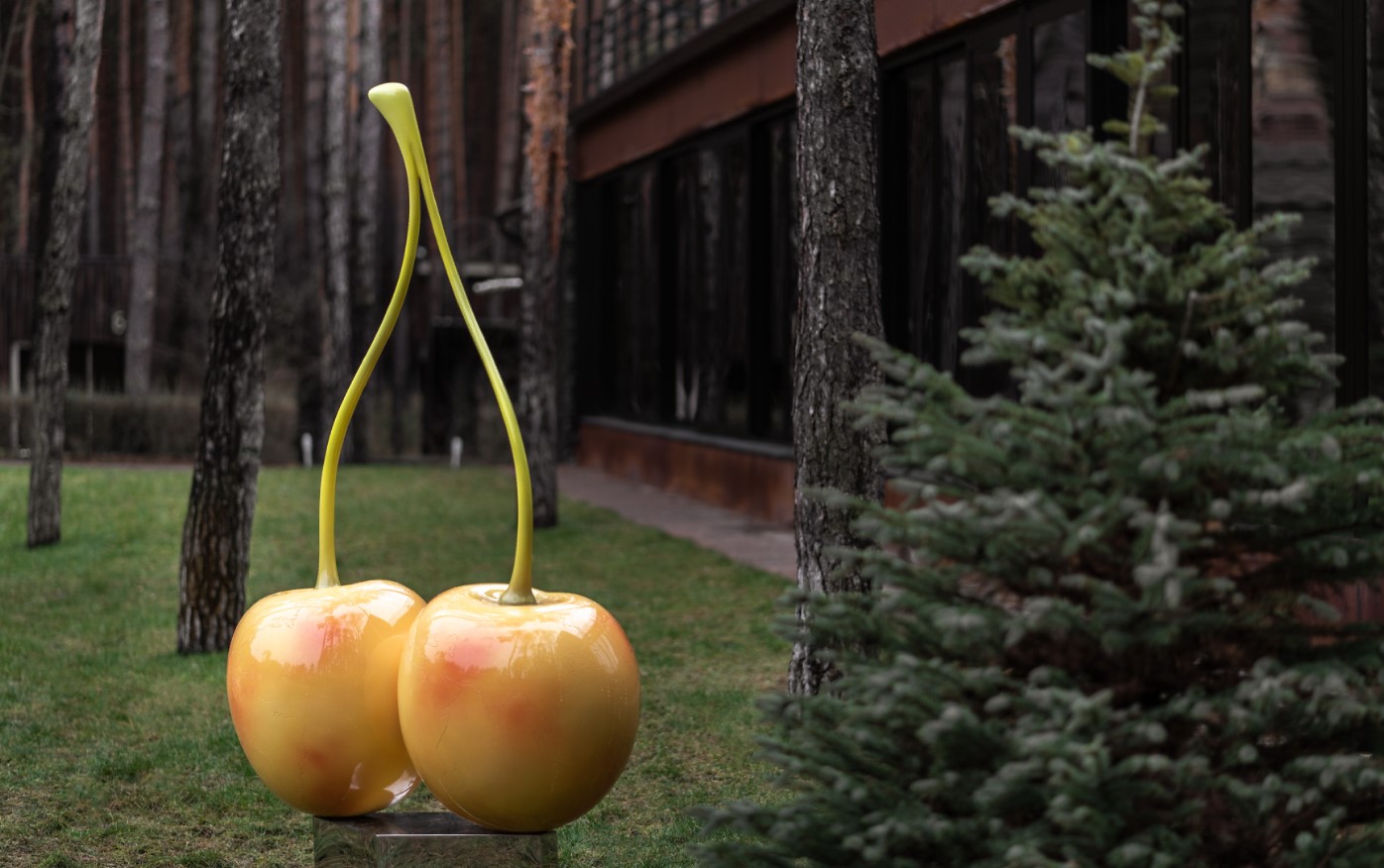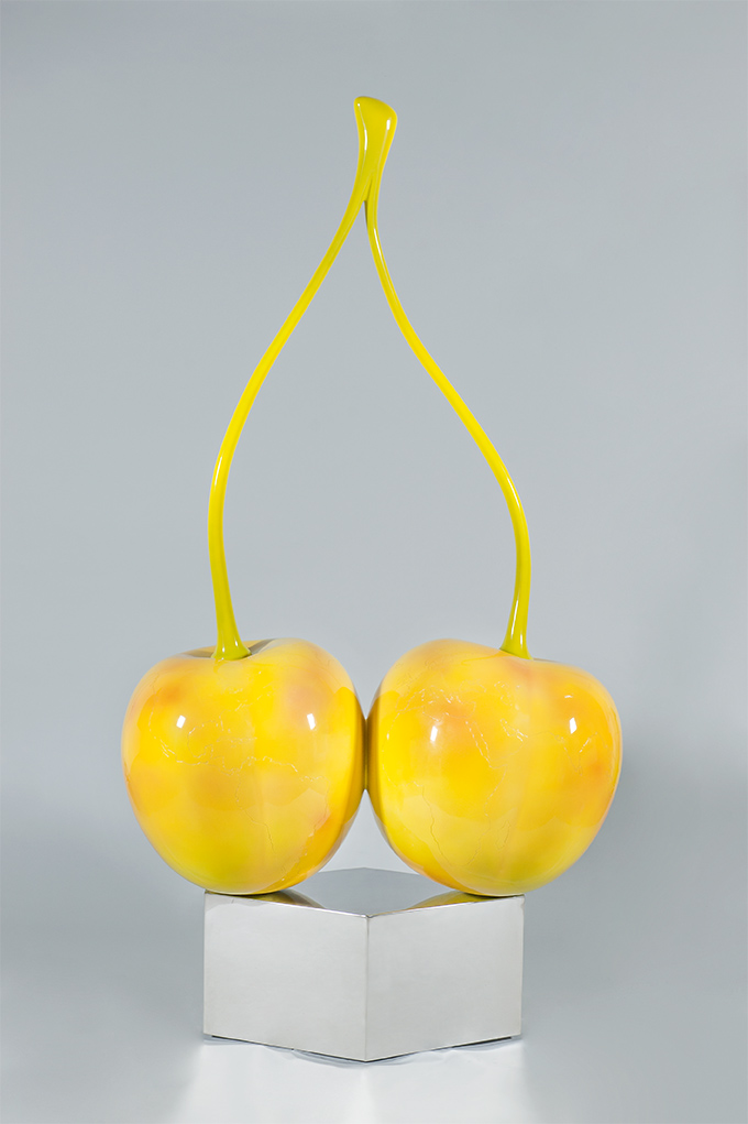 At present, the world is facing global warming. The changes are more prominent in some regions than others. They glow red on weather maps of the world like hot zones of military conflicts. The two ripe white cherries are an allegory and a creative rethinking of a global problem.