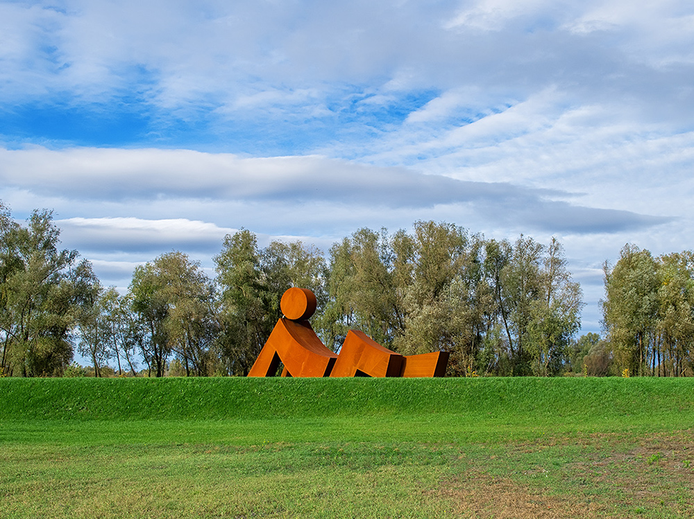 The sculpture Encounter with the Sun embodies the moment of awakening. A majestic figure that seems to surface from the depths of the earth, recreating the lines of the landscape, directs the viewer’s gaze towards the Sun as the main focus.